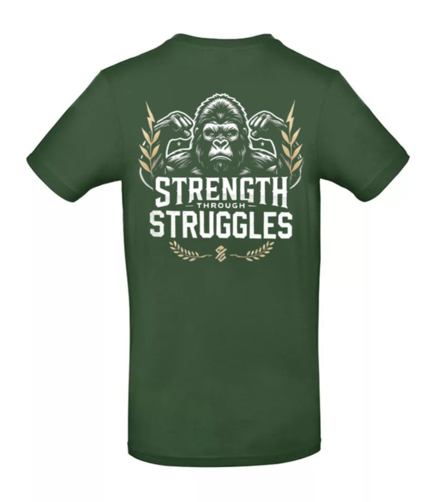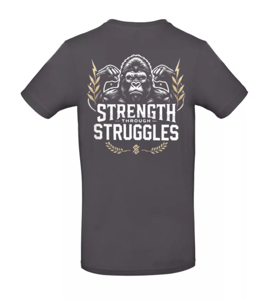 Deze t-shirt is meer dan alleen een kledingstuk – het is een statement. De krachtige gorilla op je rug staat symbool voor doorzettingsvermogen en kracht, ongeacht de obstakels. Met de tekst Strength Through Struggles herinner je jezelf en anderen eraan dat elke uitdaging je sterker maakt.